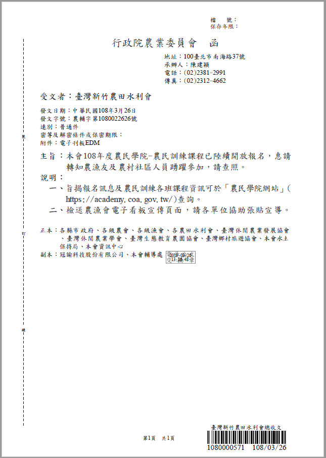108年度農民學院-農民訓練課程開放報名