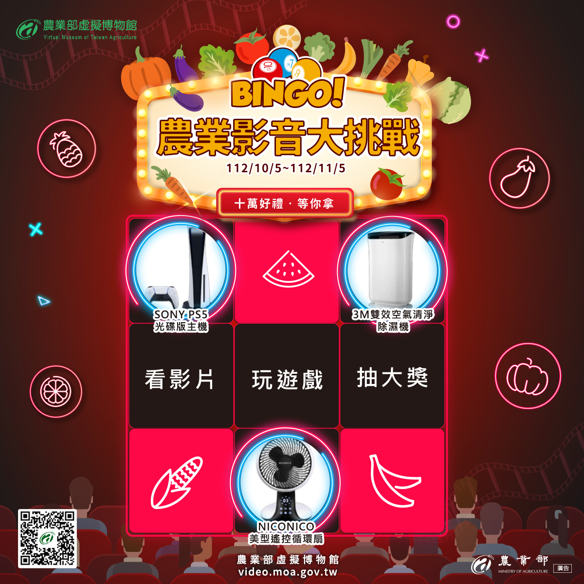 農業部虛擬博物館網站即日起至11月5日止辦理「Bingo!農業影音大挑戰」活動,獎金總價值超過10萬元,歡迎大家踴躍參加。